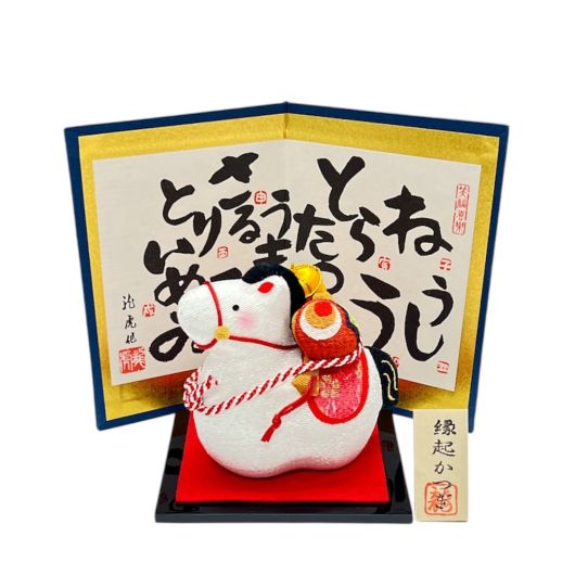 小槌や米俵をかついだ縁起のよい午の置物です。金屏風が人形を引き立てて、お部屋や玄関を明るく華やかに演出します。