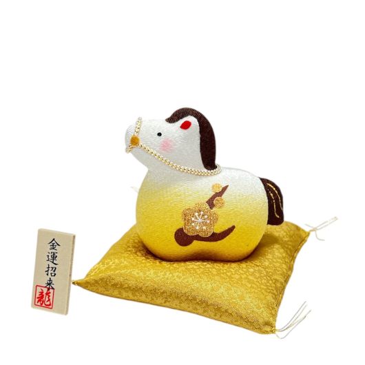 白から金への美しいグラデーションと、梅の文様をあしらった華やかなデザインが特徴の午の置物です。